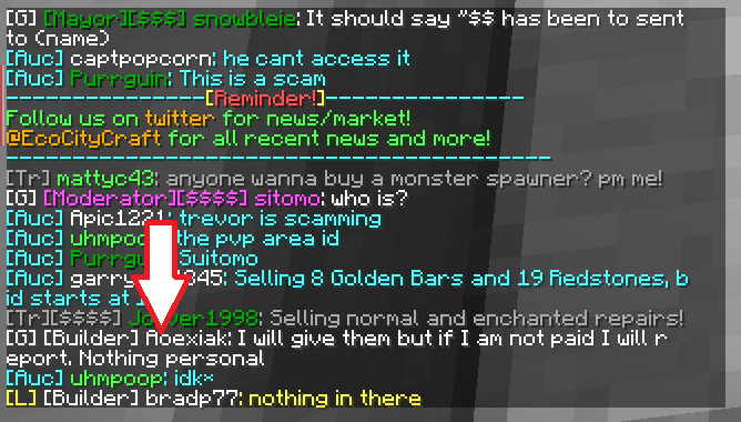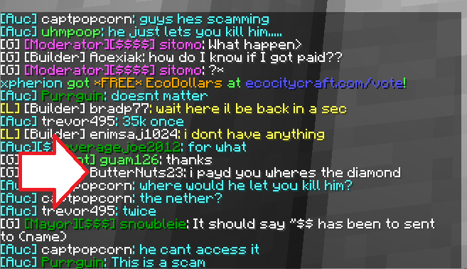 Minecraft Username: ButterNuts23 Reason: He took advantage of the fact that I'm new, said the way to trade was done through payment then drop items. He "paid" me 10,000 ECO and I gave him the 115 Diamonds. I figured out how to check my balance and it still said 2545.52 ECO. I don't care if I can't get my Diamonds back, I just want this jerk taken care of. Since this issue I've been watching him scam others all night. Counter-Reason: N/A Evidence: